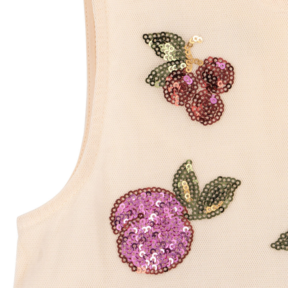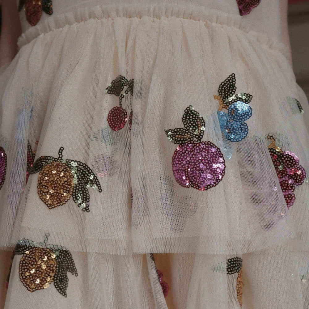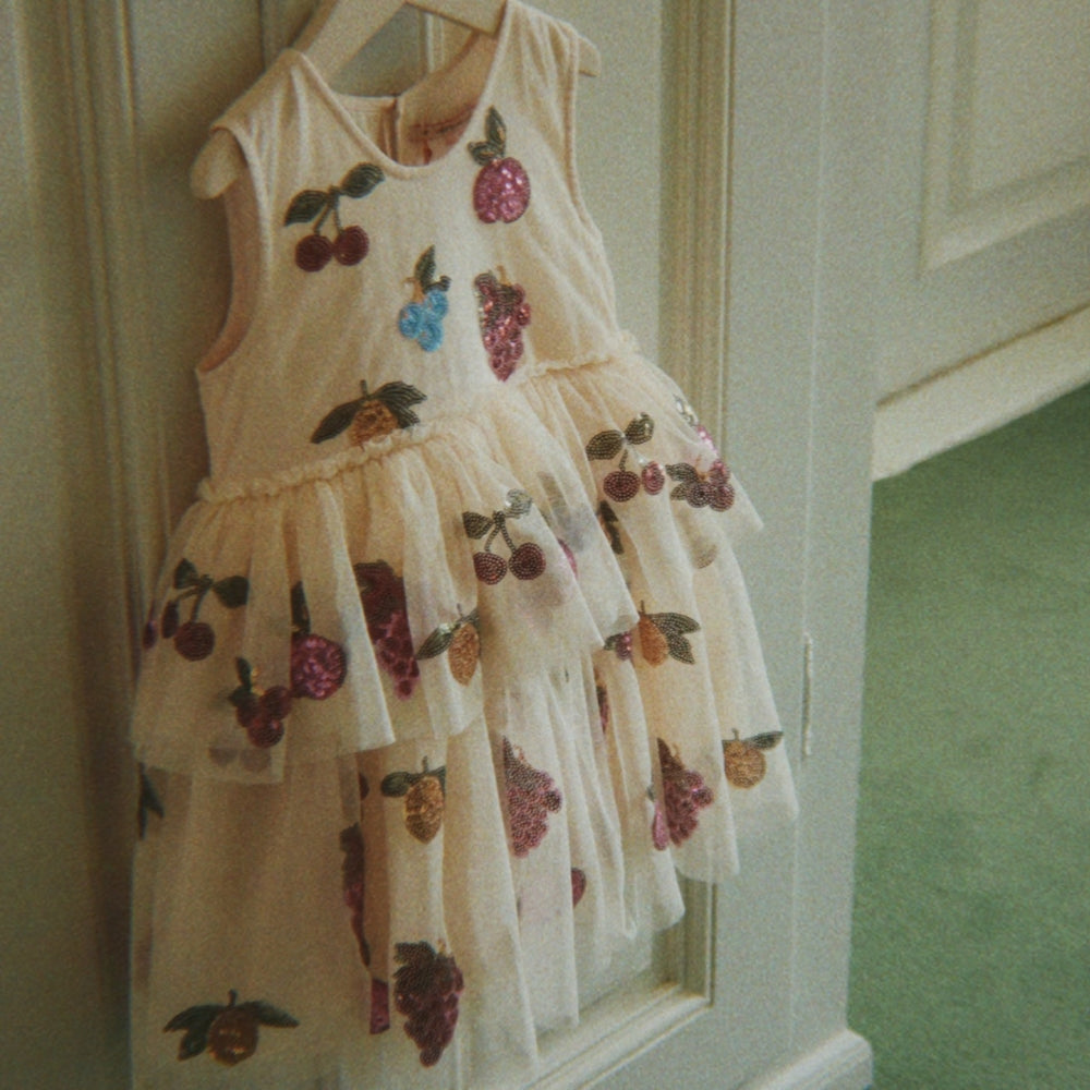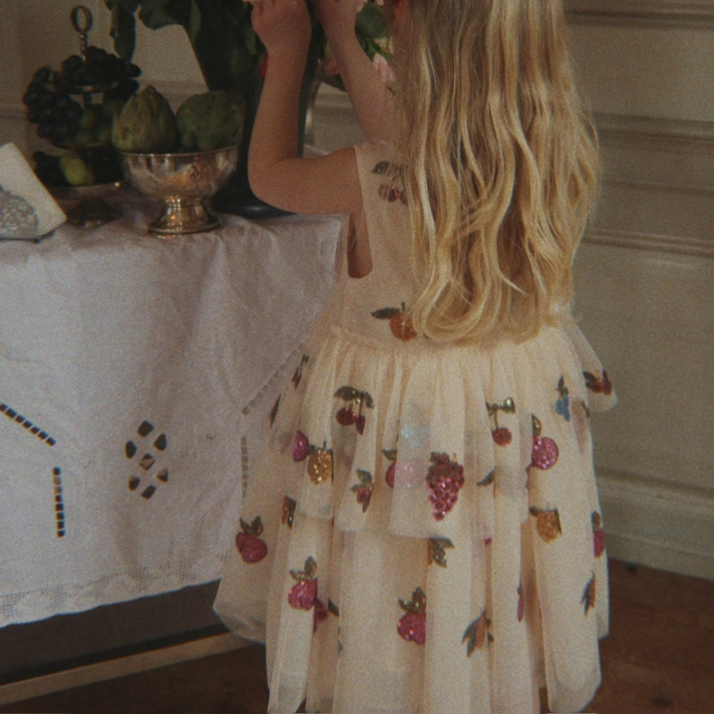 De Yvonne meisjesjurk van Konges Slojd is een sprankelende, sprookjesachtige optie voor kleine feeën die van dansen en twirlen houden.