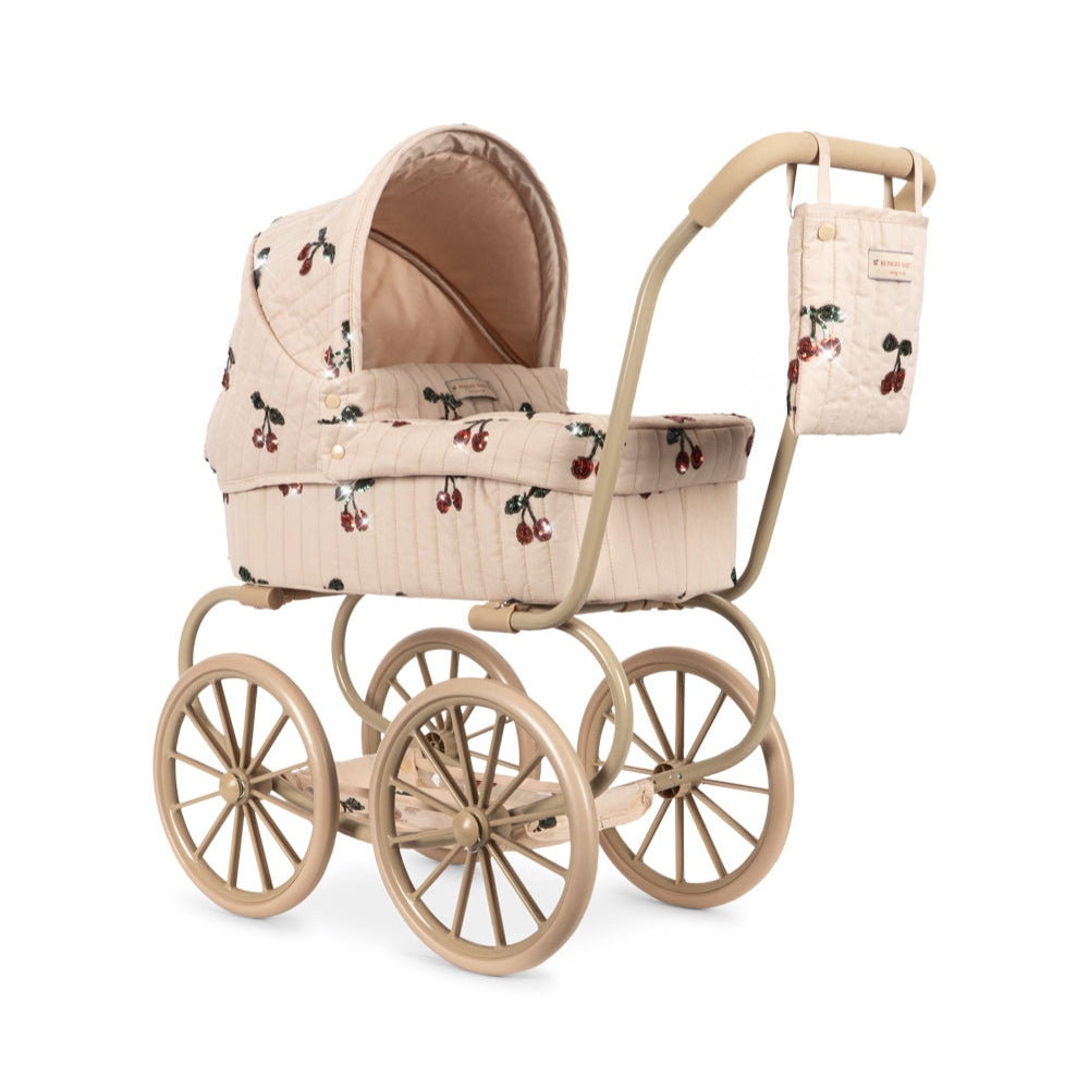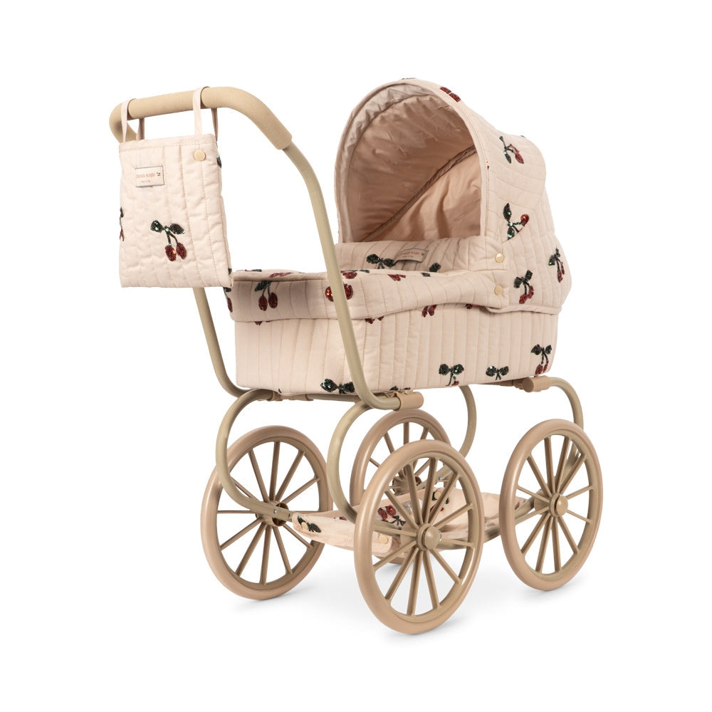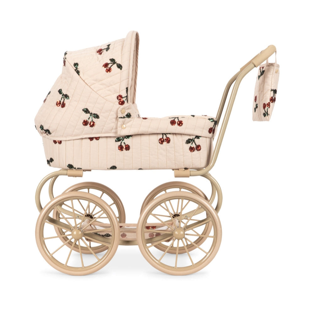De poppenwagen met de kenmerkende kersenprint van CHERRY stimuleert het vertellen van verhalen, verzorging en samen wandelen.