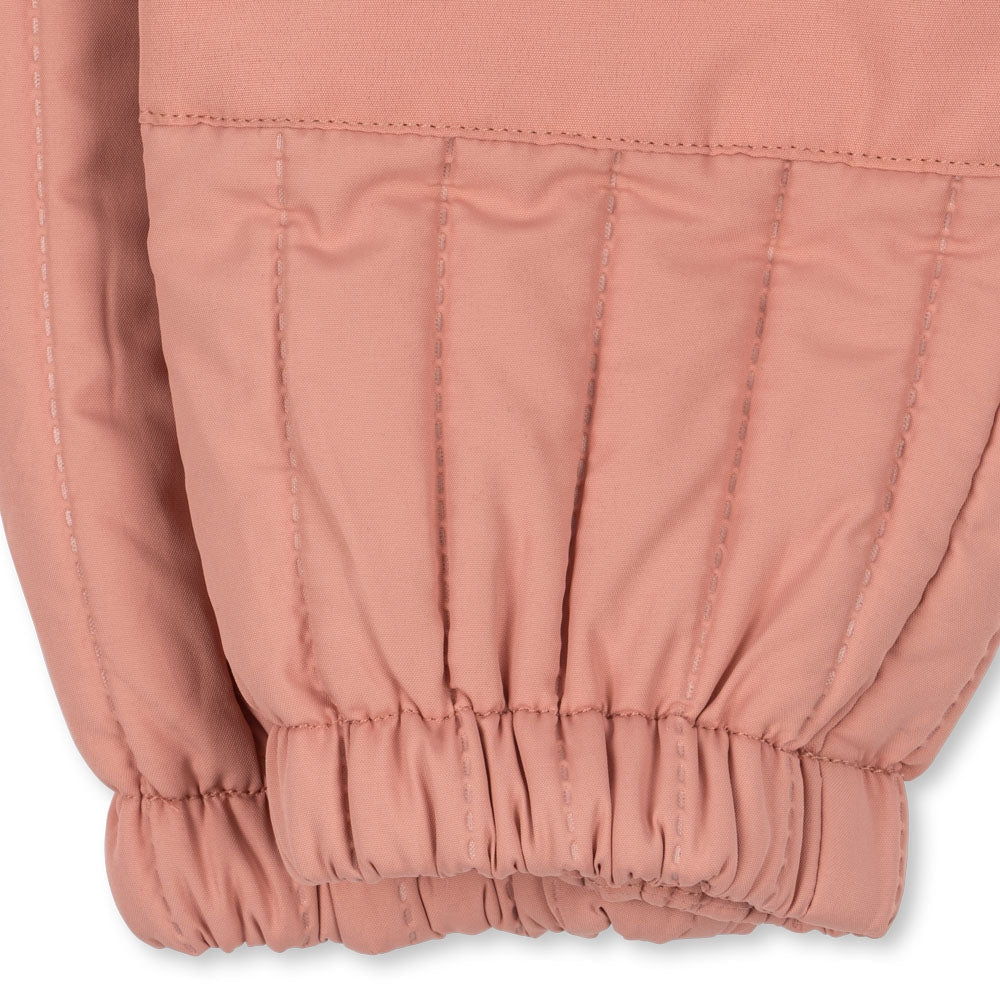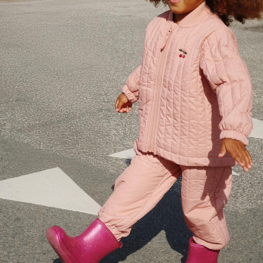 De set, bestaande uit een broek en een getailleerd jack, zorgt voor bewegingsvrijheid, zowel tijdens het spelen op de kleuterschool als op weg naar school.