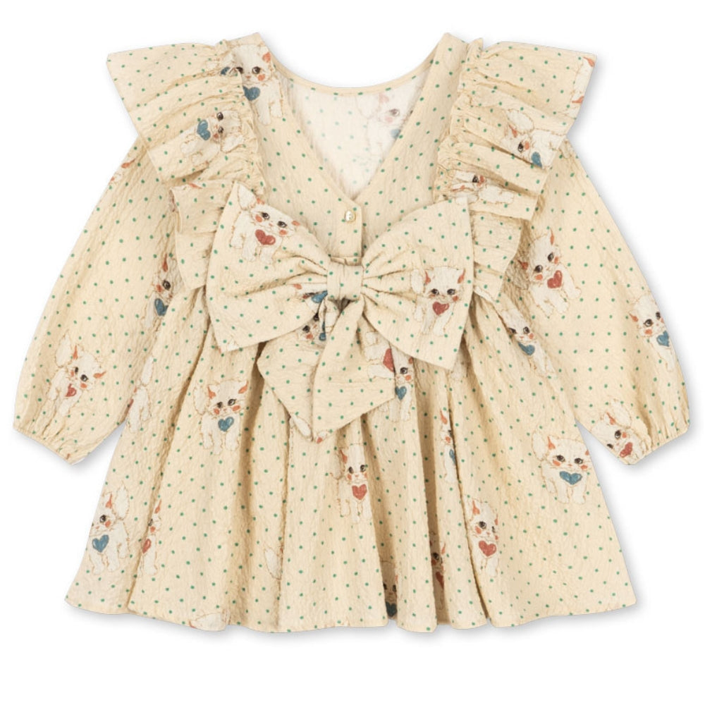 De jurk voor meisjes onderscheidt zich door de charmante buffetmouwen, subtiele ruches en een decoratieve strik op de rug, die het een meisjesachtige charme en elegantie geven.