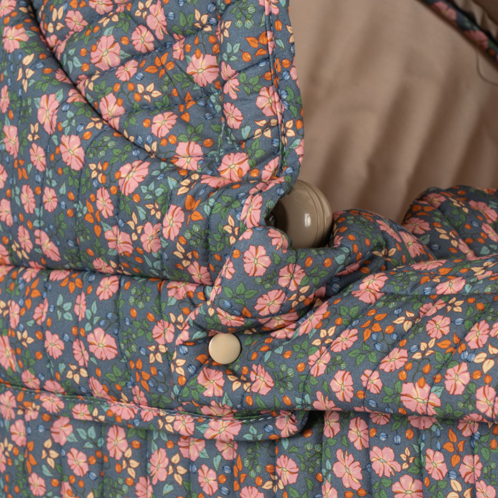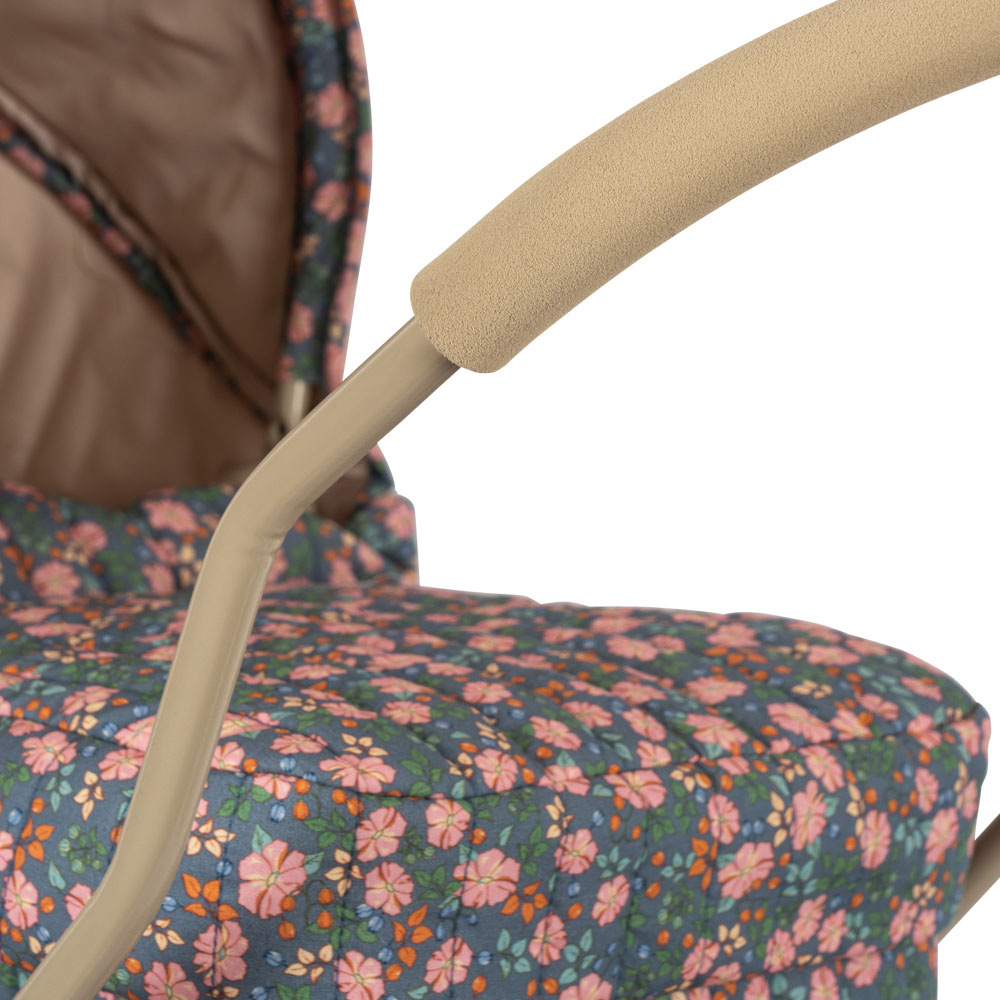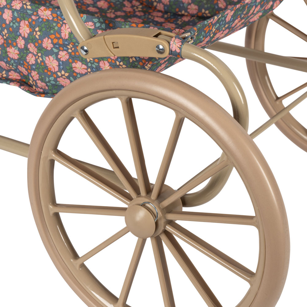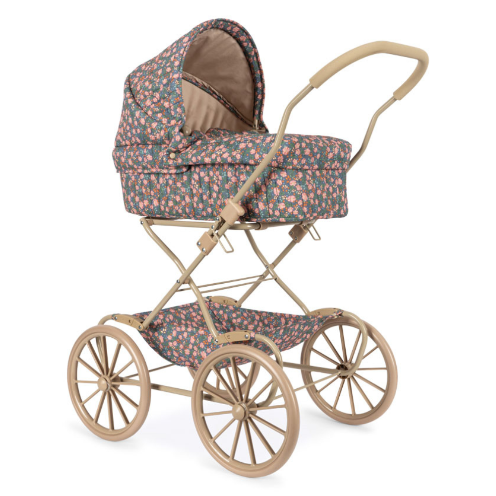 Deze elegante poppenwagen brengt plezier in de wereld van vintage stijl: vier grote wielen, zacht gewatteerde stof, subtiele golvende randen en een comfortabel matras creëren een knusse ruimte voor je favoriete pop.