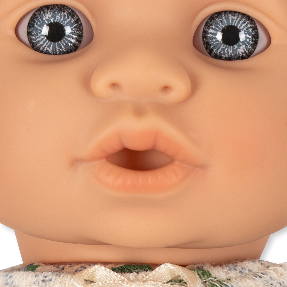 Deze schattige pop is gekleed in een zachte pyjama en wordt geleverd met haar eigen fopspeen en teddybeer - perfect gezelschap voor avondknuffels.