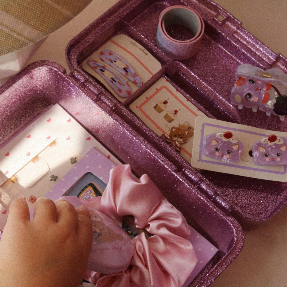 Das ist das perfekte Accessoire-Set im Koffer für kleine Stylisten - darin befinden sich Bobby Pins, Gummibänder, ein Spiegel und eine Bürste, alles in einem praktischen Etui, das man leicht mitnehmen kann.