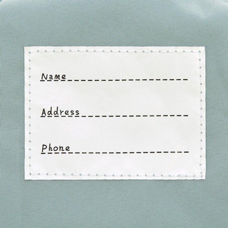 Een handig label met naamkaartje maakt het mogelijk de naam van het kind en het telefoonnummer van de ouders te noteren