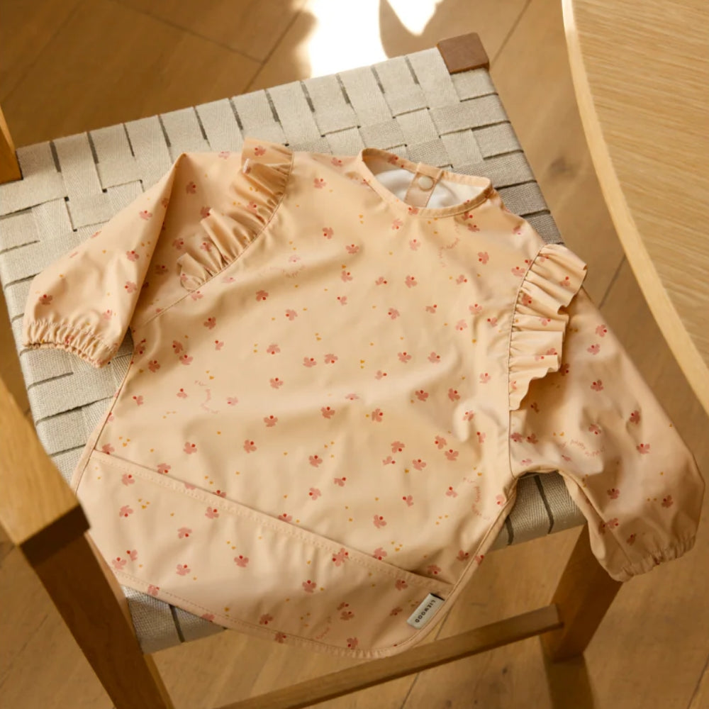 Dankzij het feit dat het slabbetje lange mouwen en elastische boorden heeft, beschermt het de kleding van de baby perfect tegen gemorst voedsel.