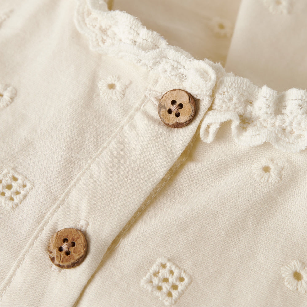 Die cremefarbene Farbe und das subtile, klassische Muster verleihen ihm einen einzigartigen Charme, während die sorgfältige Verarbeitung die Liebe zum Detail der Marke Lil' Atelier unterstreicht.