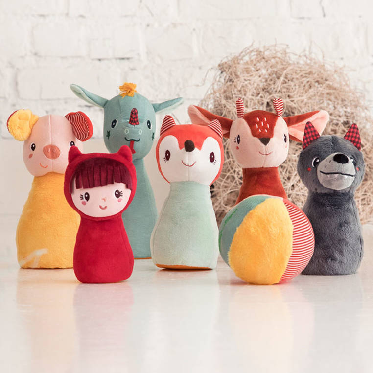 Die Figuren - Alice der Fuchs, Stella der Hirsch, Simon das Schwein, Joe der Drache, Louis der Wolf und Rotkäppchen - haben die Form klassischer Kegel, sind aber weich, leicht und bunt.