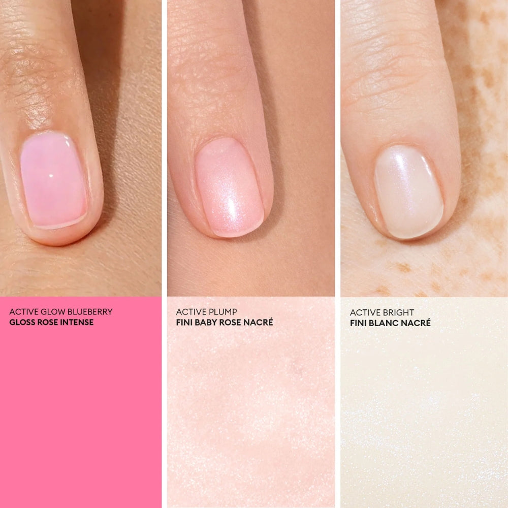 De tweede nagellak, Active™ Plump, verrijkt met plantaardig collageen en perzikextract, geeft de nagels volume en een parelroze tint.