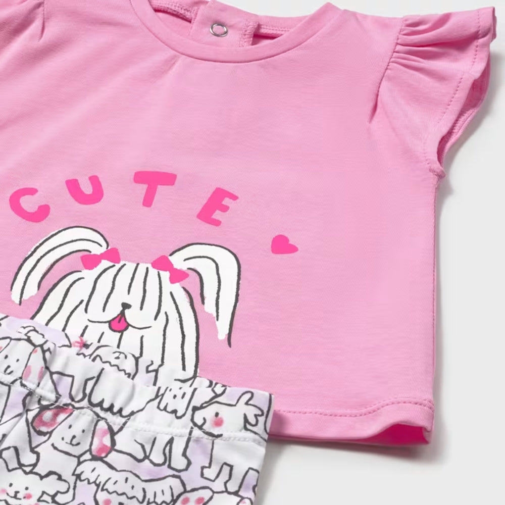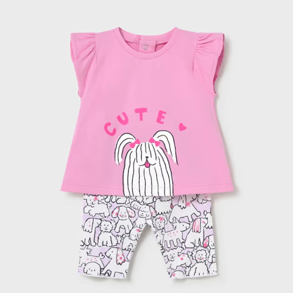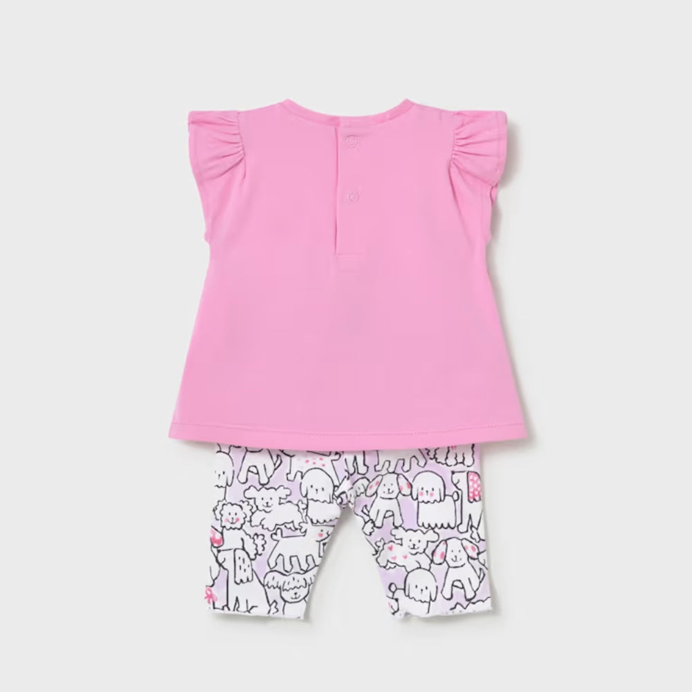 De Mayoral set bestaat uit een roze T-shirt en een legging versierd met een hondenmotief, waardoor de alledaagse styling van de baby er speciaal en gezellig uitziet.
