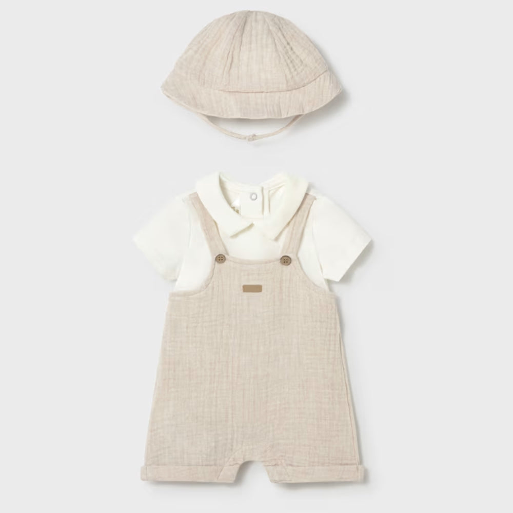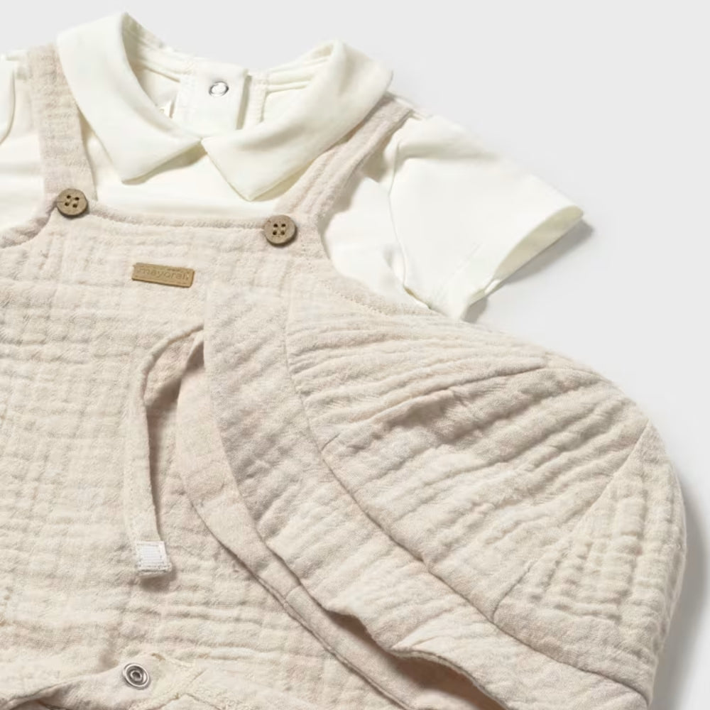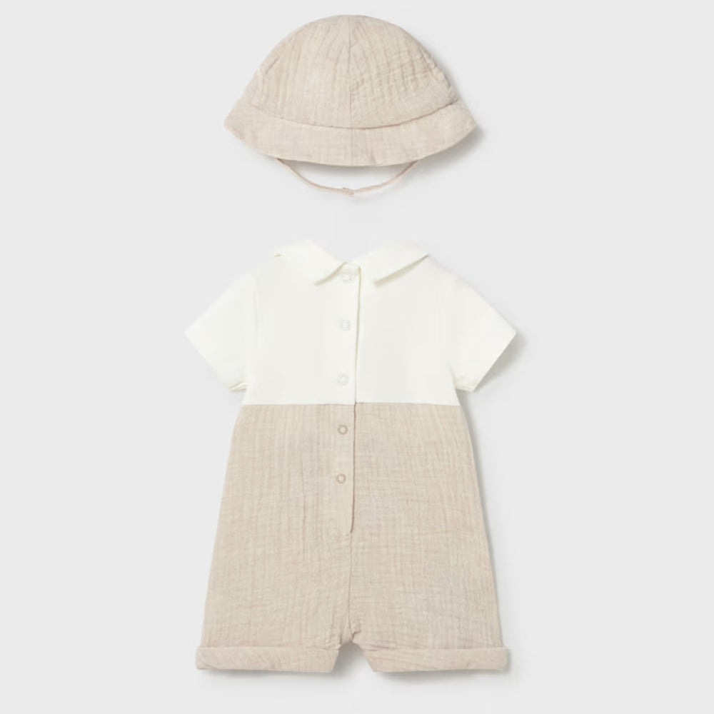 De baby romper met imitatie tuinbroek en bijpassende muts creëren een samenhangende styling ontworpen door Mayoral voor baby's eerste dagen.