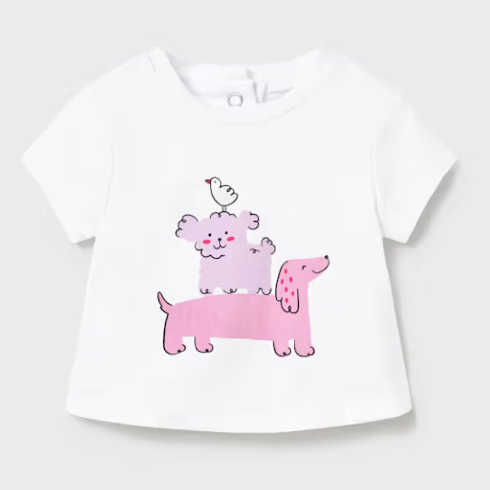 Het T-shirt met korte mouwen is versierd met hondenmotieven, wat zorgt voor een leuke en vriendelijke touch.