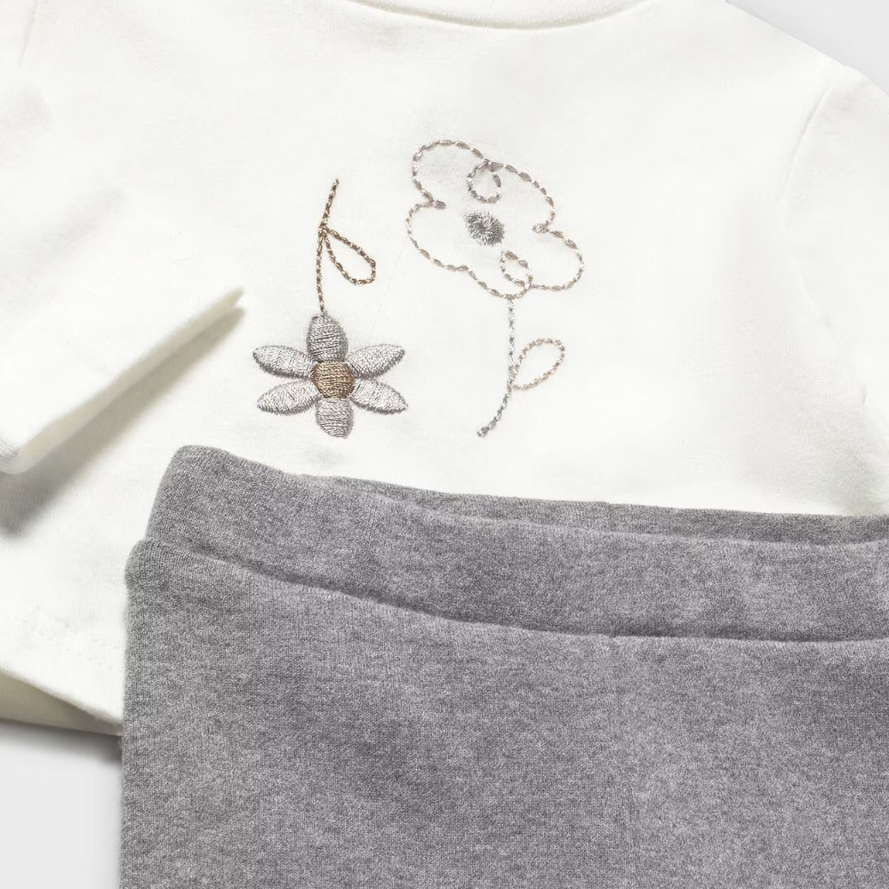 Het zachte T-shirt met borduursel en zeefdruk sluit met praktische drukknopen op de rug, terwijl de elastische legging de buik niet samendrukt.