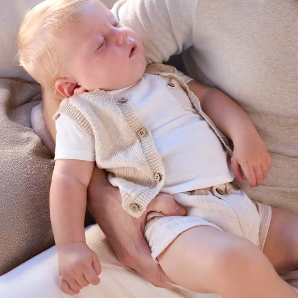 De set bestaat uit een beige korte broek, een wit shirt met korte mouwen en een vestje, waardoor een samenhangend en zeer esthetisch ensemble ontstaat dat geschikt is vanaf de eerste levensdagen.
