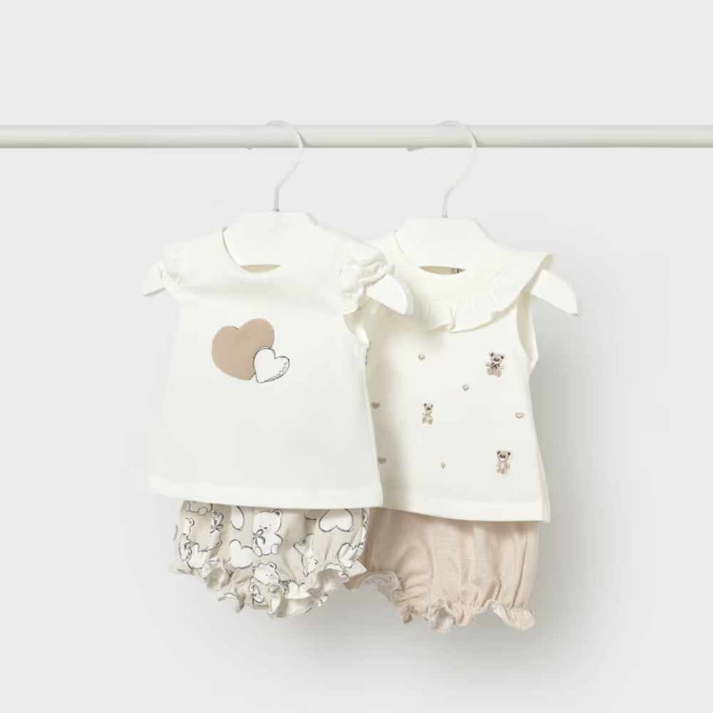 De babyset bestaat uit twee shirts en twee shorts, zodat je de stukken gemakkelijk kunt afstemmen op het weer en het ritme van de dag.