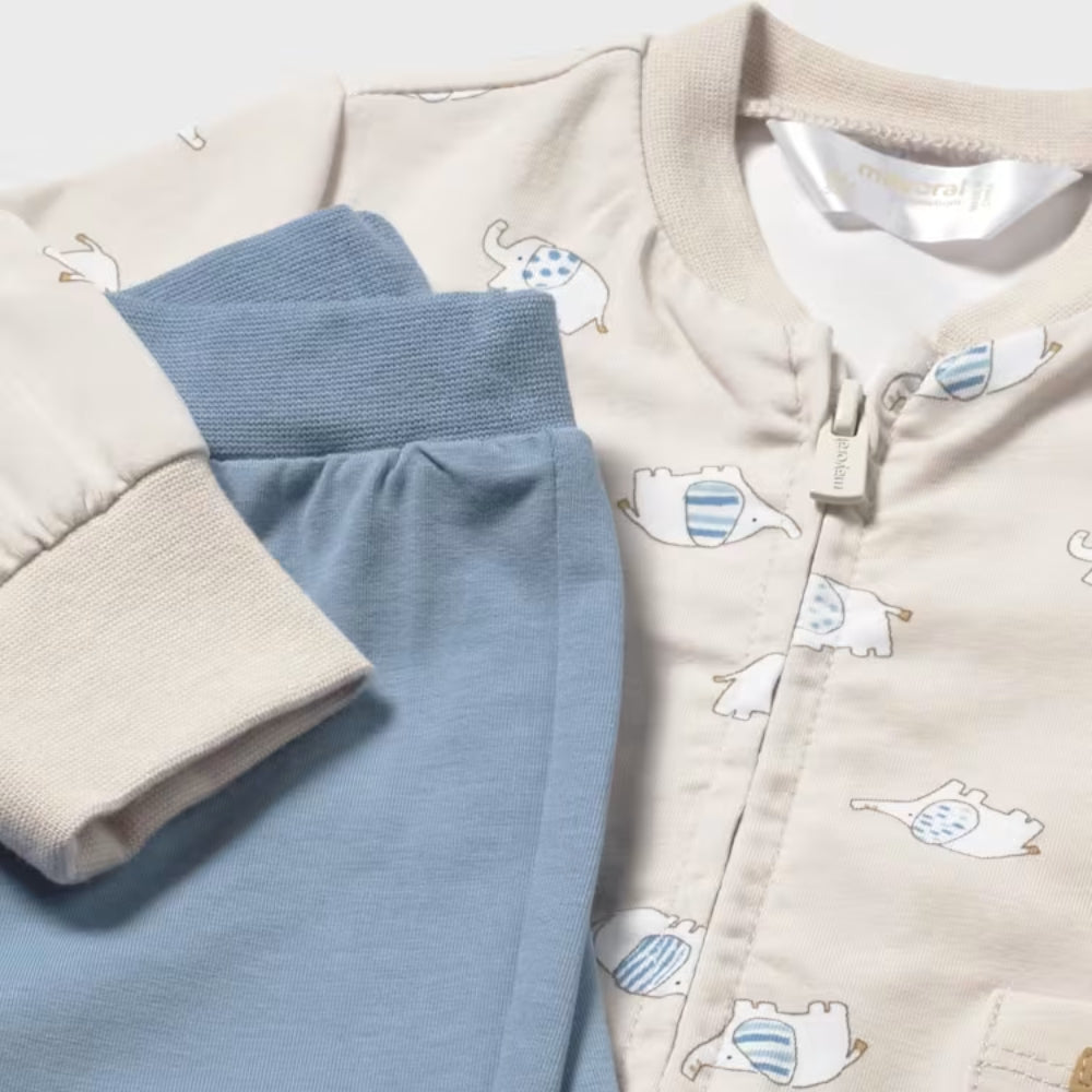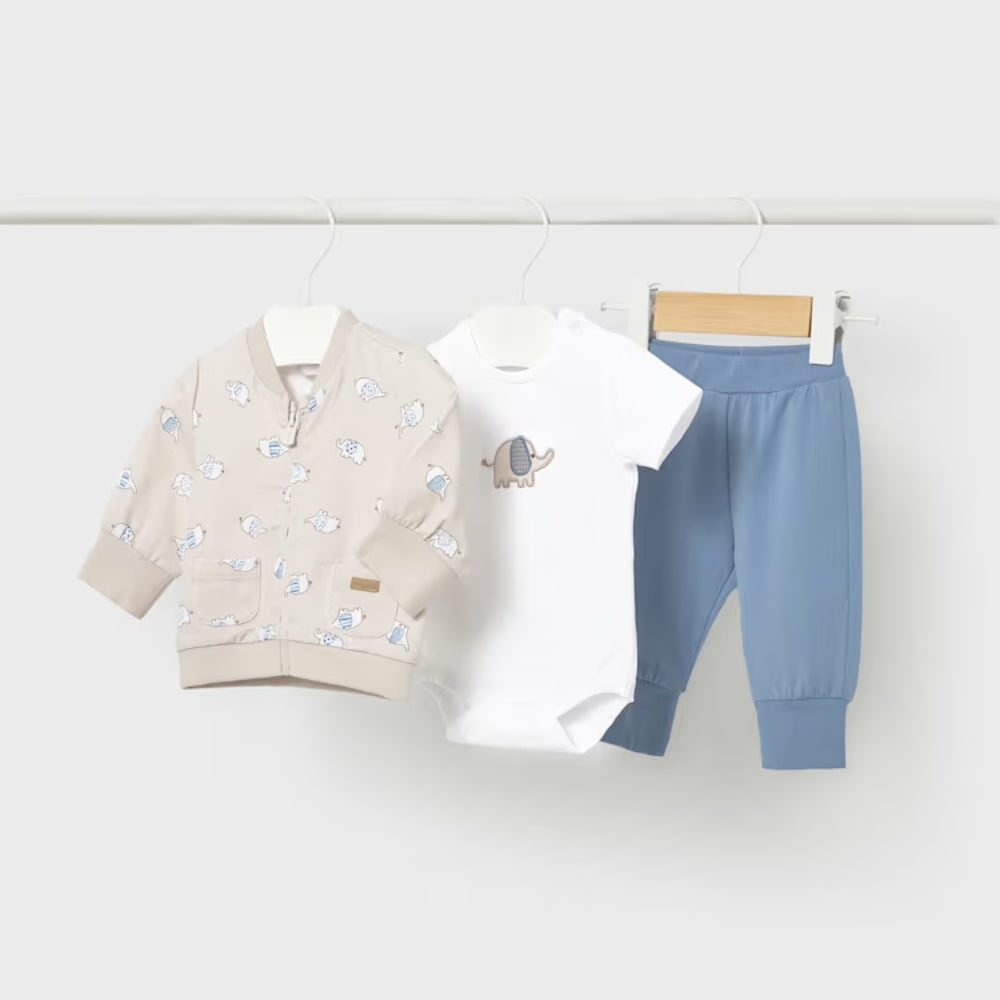 De set bestaat uit een wit rompertje met een geborduurd babyolifantje, een beige sweater met rits en een blauwe trainingsbroek, die allemaal samen een complete set vormen.