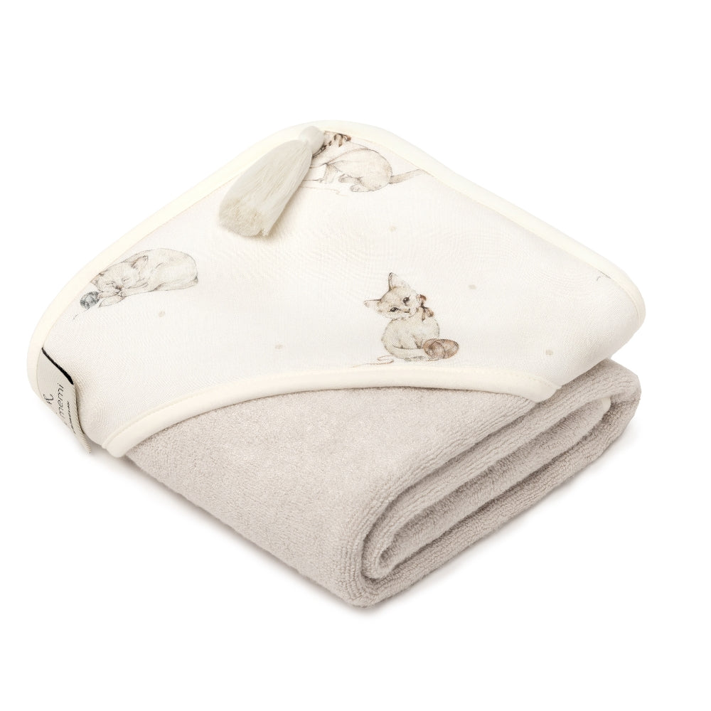 De Memi baby handdoek heeft een kap, een handgreep aan het uiteinde en een functionele nekbeugel voor ouders om gemakkelijk te kunnen zuigen.