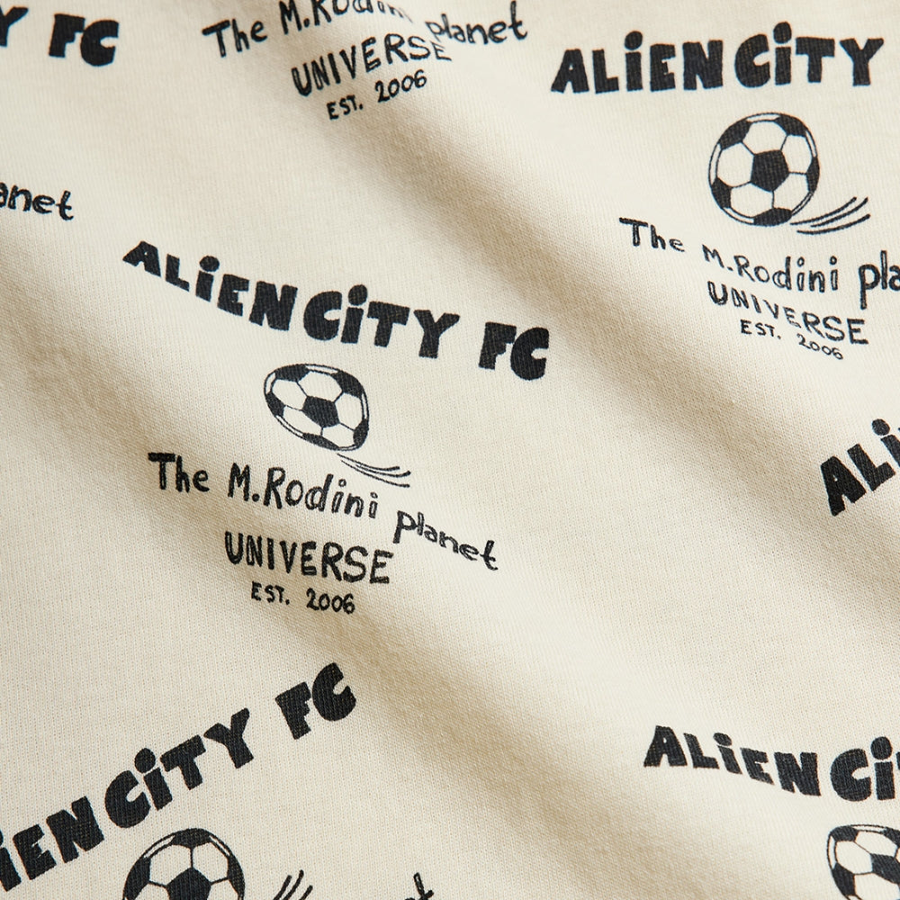 De licht crèmekleurige basis is bedekt met een zwarte print met ballen en letters van Alien City FC, wat het geheel een sportieve, speelse uitstraling geeft.