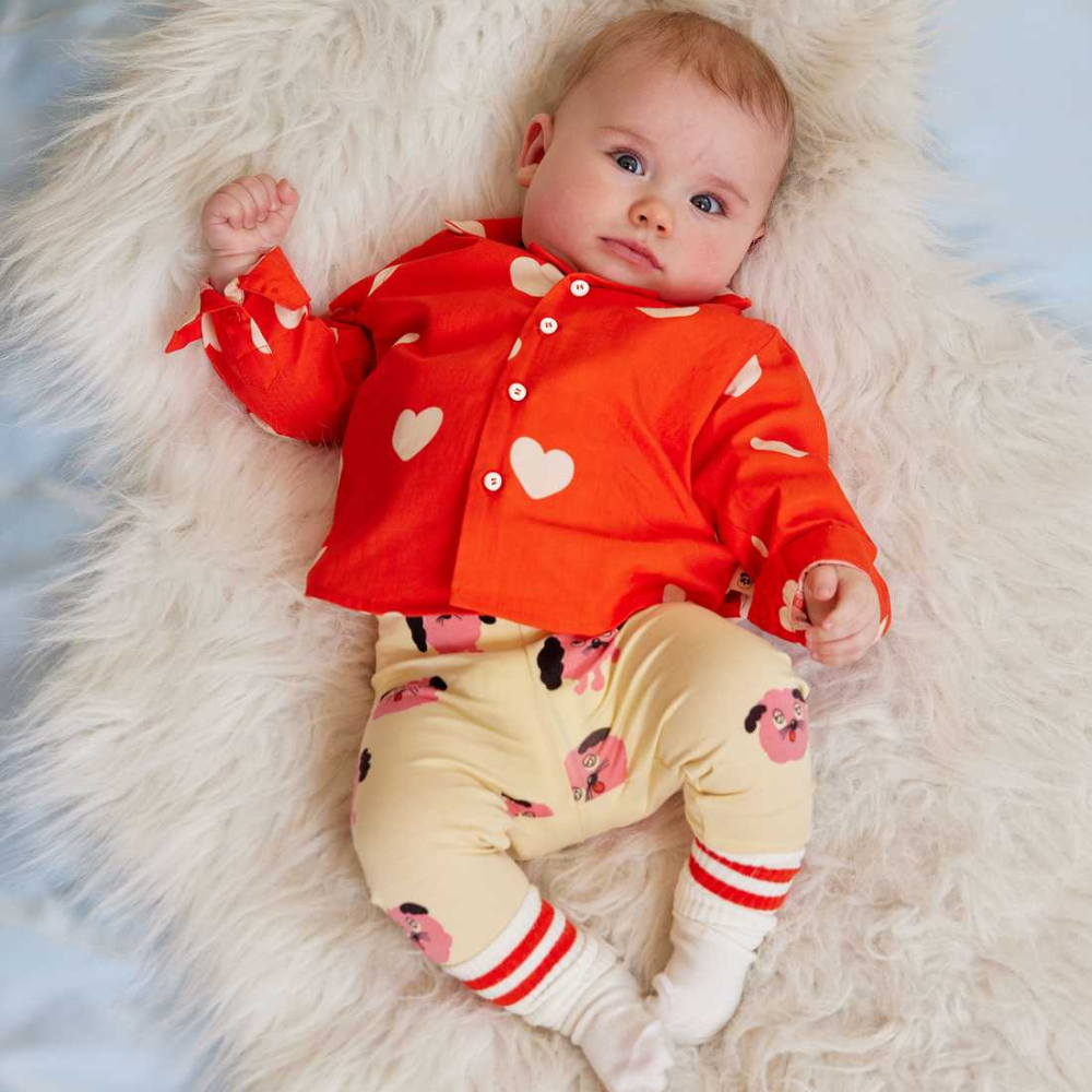 Het hondjespatroon in de typische Mini Rodini-stijl voegt karakter toe aan de hele look en maakt de broek geweldig voor alledaagse styling, maar ook voor naar de kleuterschool of om uit te gaan.