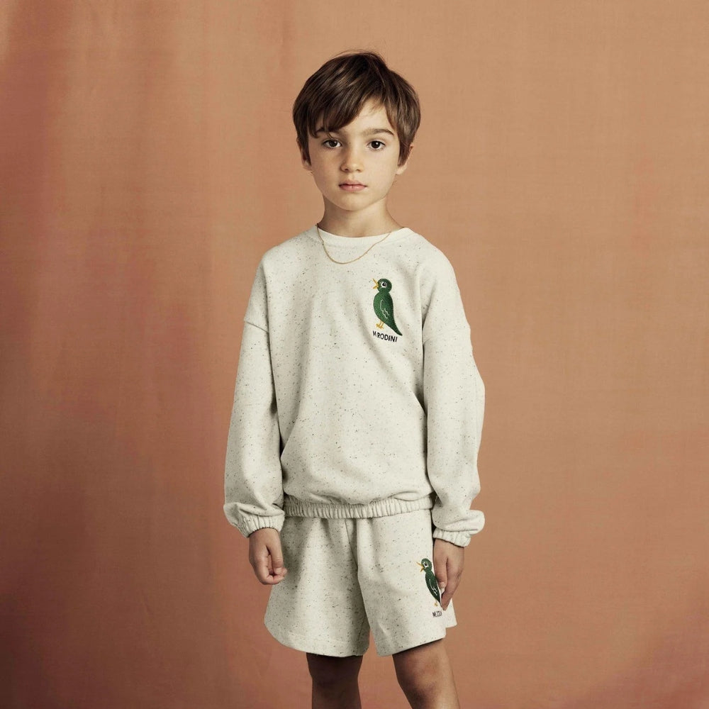 De geribde kraag accentueert de casual stijl van het sweatshirt, terwijl de delicate geborduurde vogelpatch op de borst een subtiel maar opvallend detail is, in lijn met de esthetiek van het merk Mini Rodini.