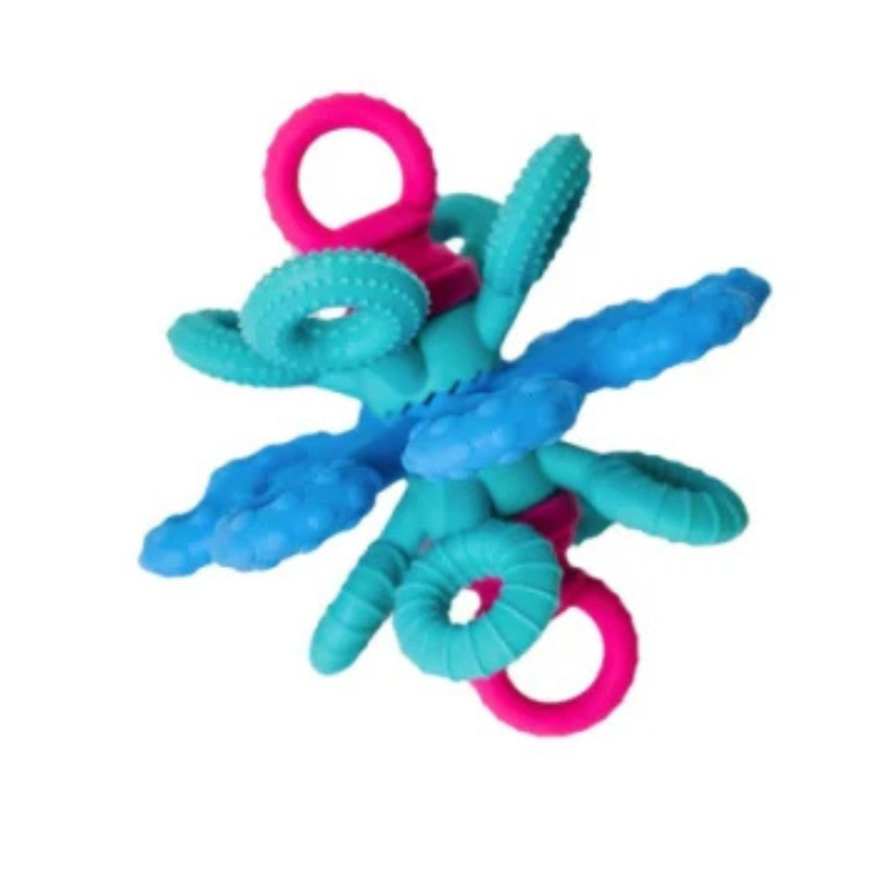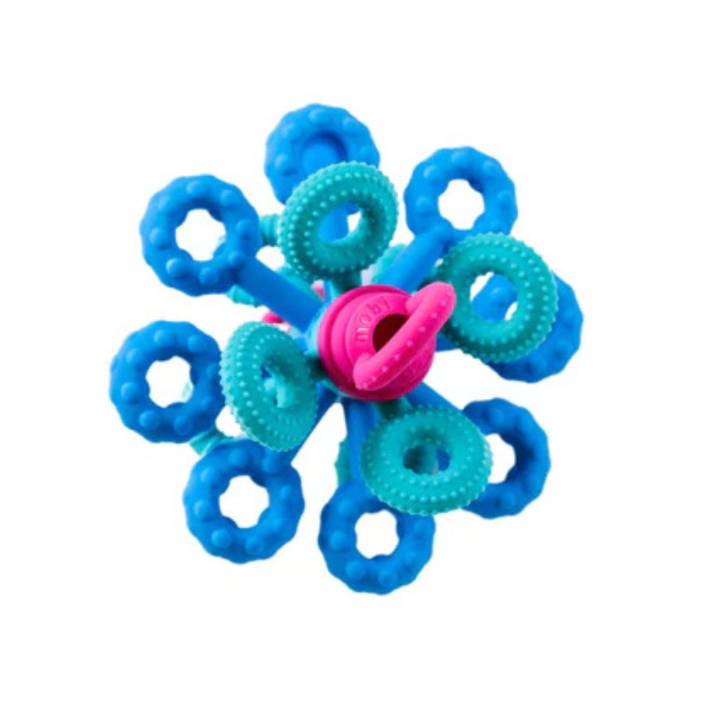 De 18 flexibele siliconen armen moedigen strekken, knijpen, draaien en bijten aan, terwijl de gekartelde randen van de drie ringen aangename, zachte trillingen geven als ze rondgedraaid worden.