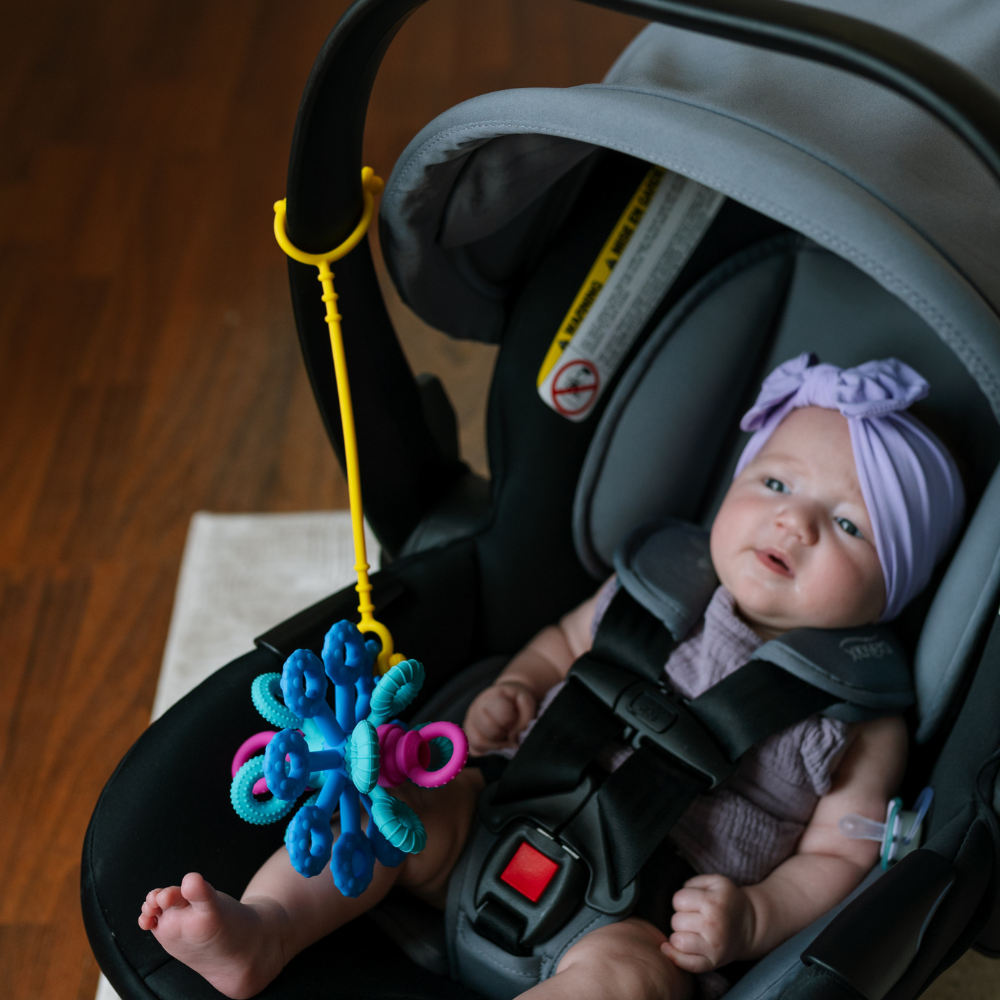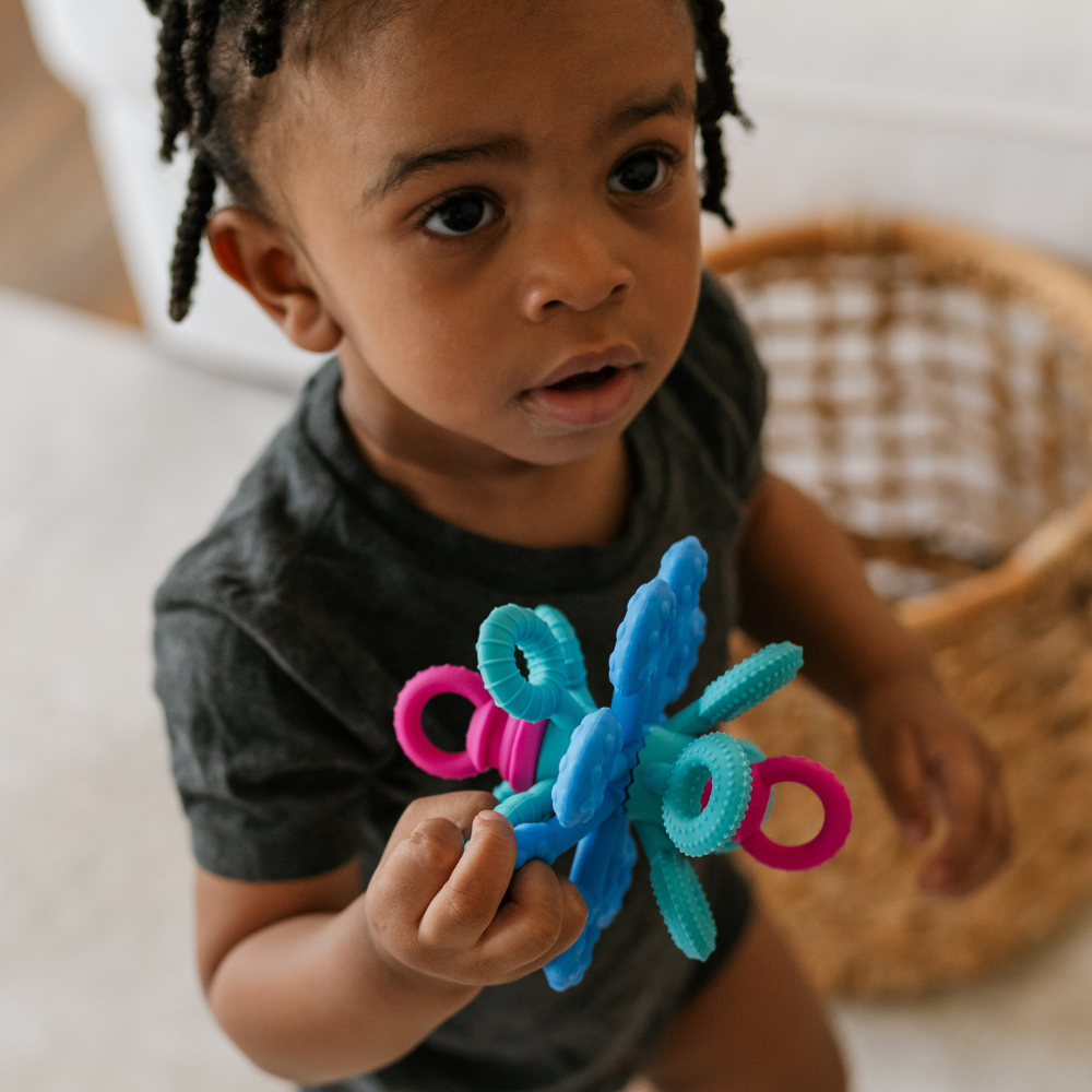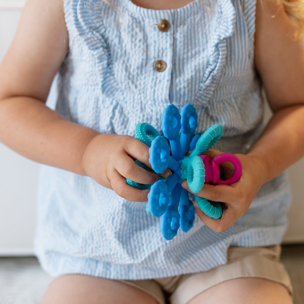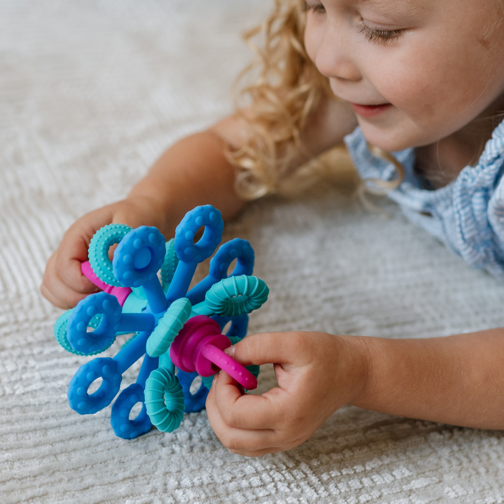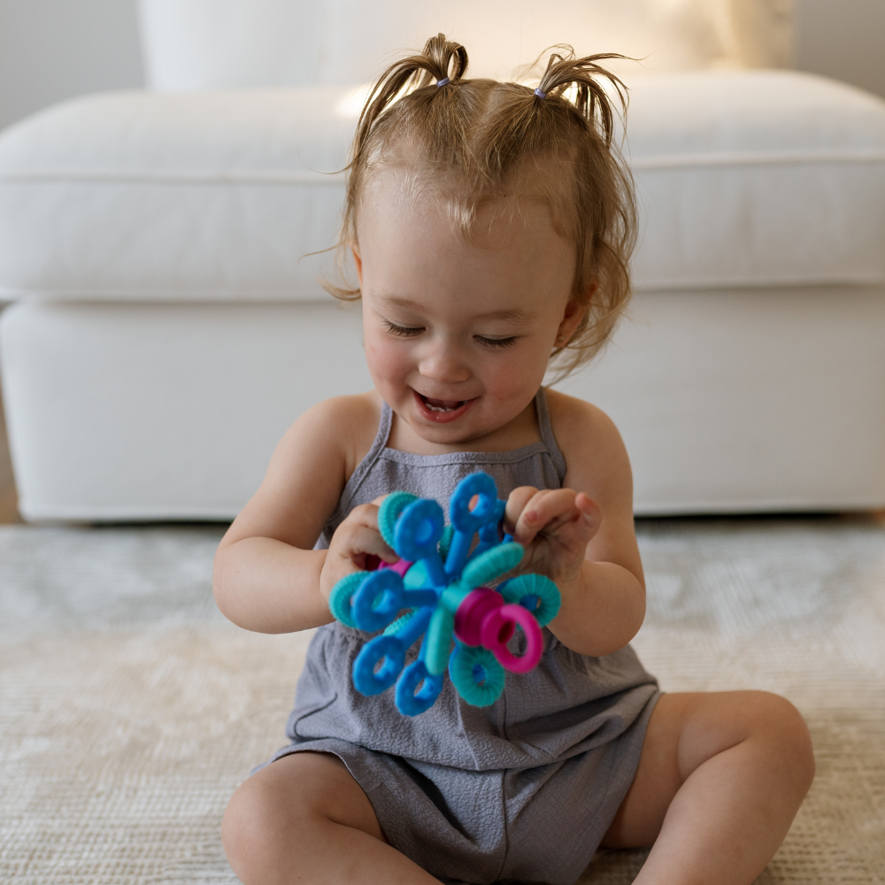 Dit sensorische speelgoed combineert een aantrekkelijke vorm met functionaliteit - de zachte siliconen voelen prettig aan en de interactieve elementen moedigen zelfontdekking aan.