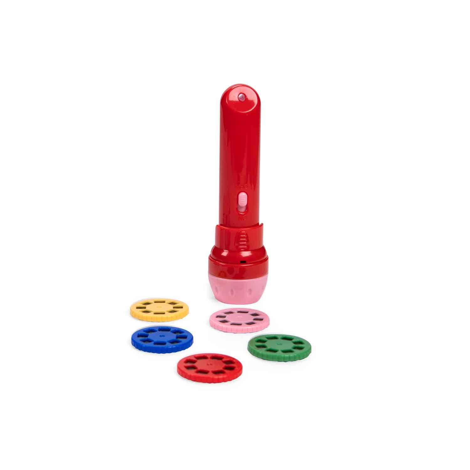 Steek de schijf van je keuze in de fitting, zet de lamp aan en schijn ermee op een vlakke ondergrond, draai dan aan de draaiknop om het beeldverhaal voort te zetten.