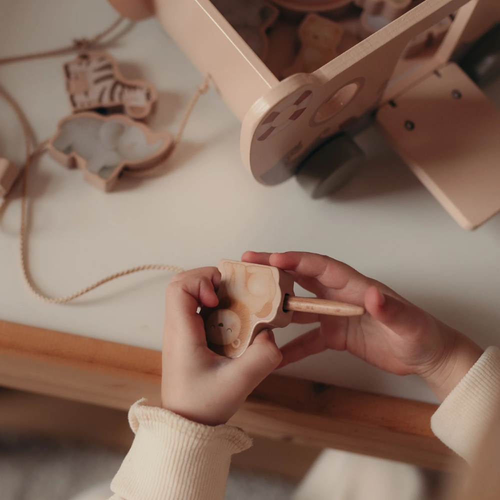 Dit is de ideale set om al doende te leren - de peuter sorteert, rangschikt, rijgt en rolt, en de houten boot op wielen wordt de basis voor eindeloze scènes en reizen.