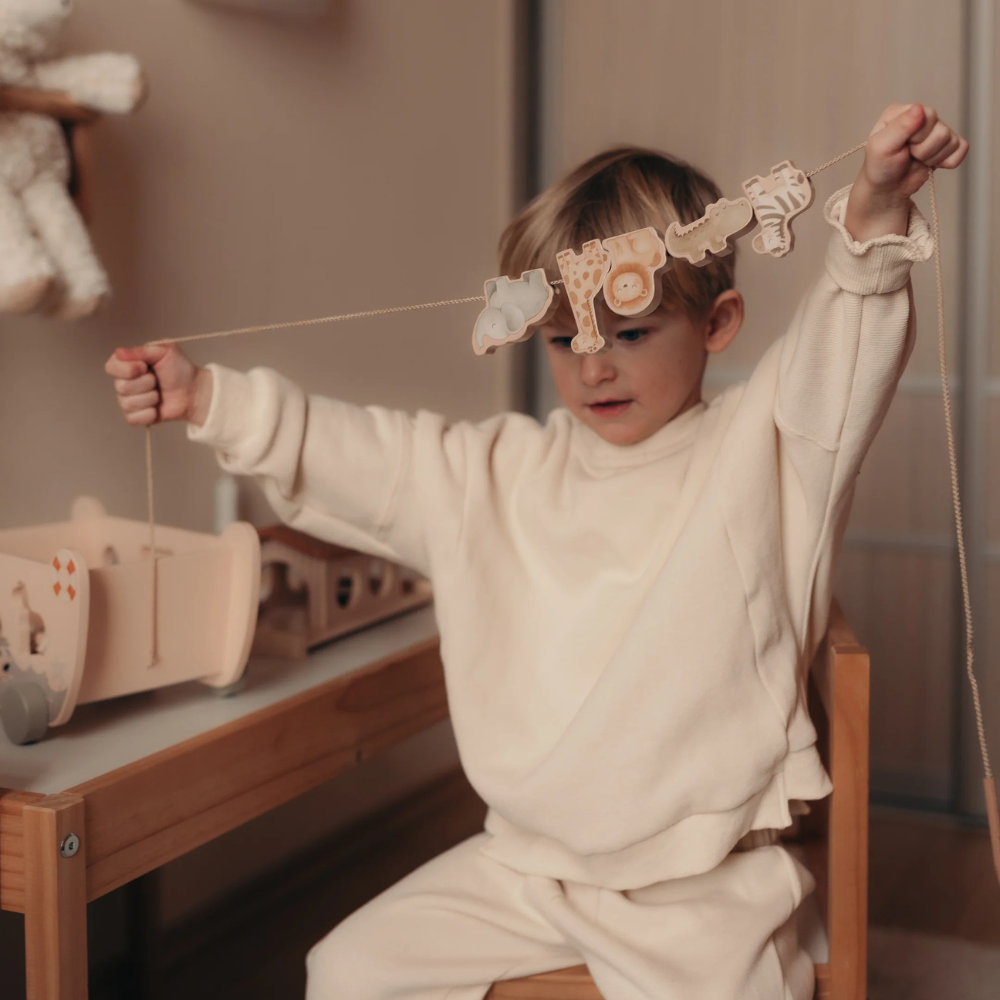 De set bestaat uit maar liefst 22 onderdelen: 14 dieren, een regenboog, een ladderhelling, een boot op wielen en een touwtje met een houten punt om de figuurtjes doorheen te rijgen.