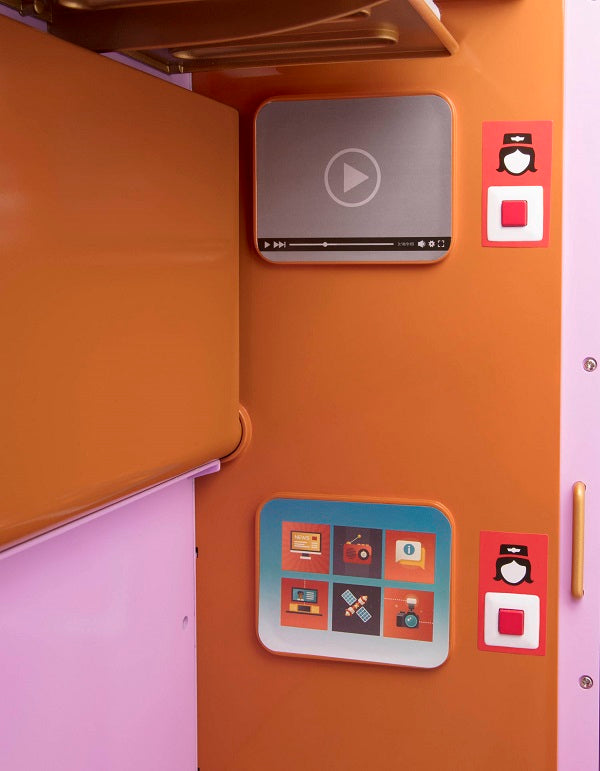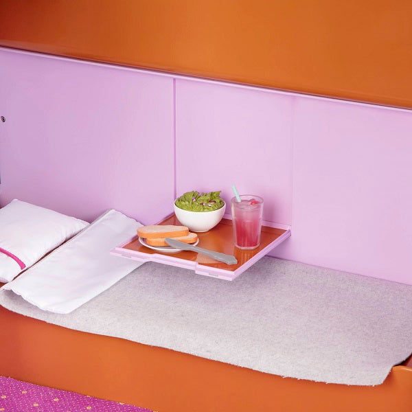 Aan de ene kant van de wagon is een slaapgedeelte met een wastafel en ruimte voor twee poppen, aan de andere kant is een eetgedeelte met een tafel en slimme opbergvakken voor accessoires.