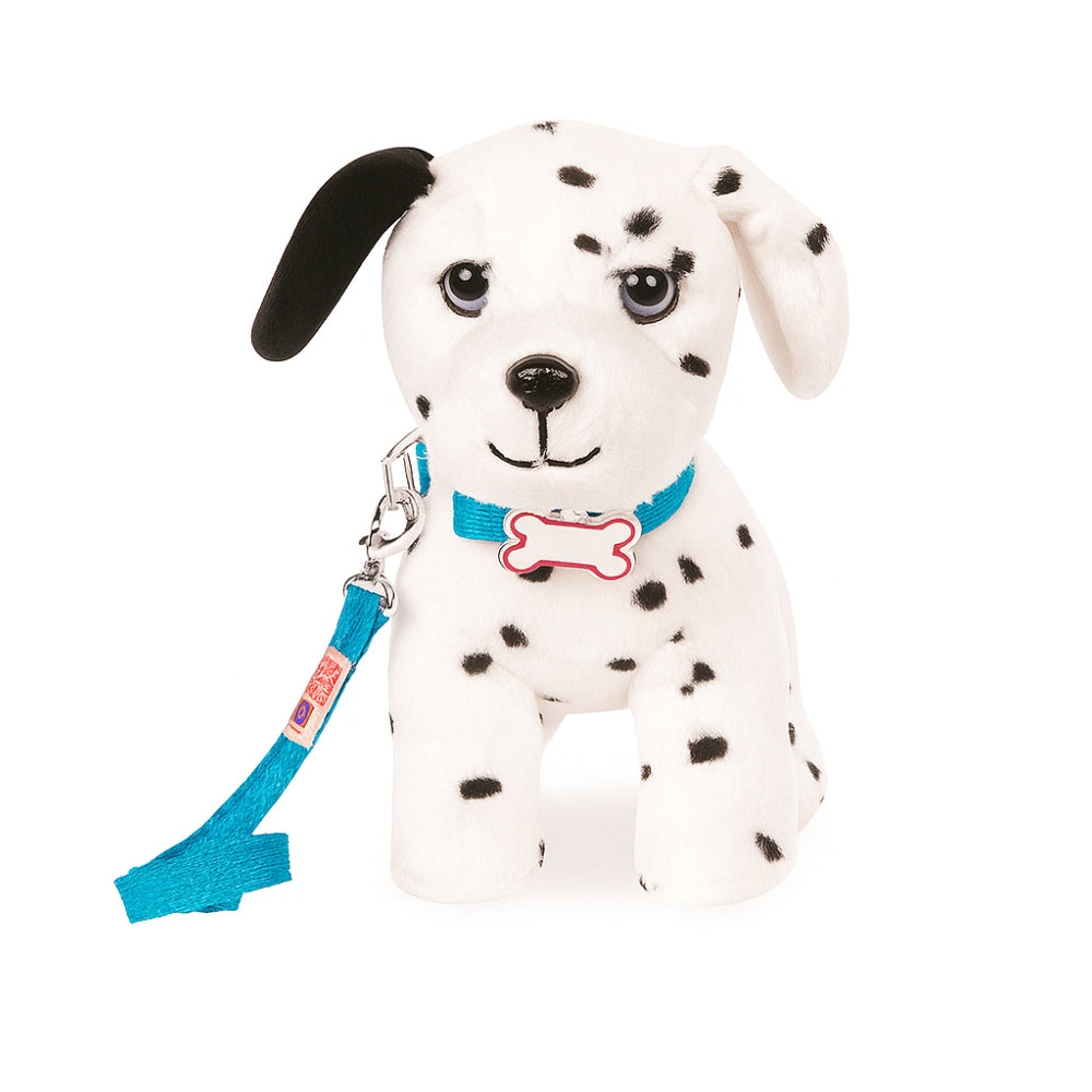 Our Generation Dalmatiër knuffel puppy is een schattige pluche puppy met halsband en riem, klaar voor wandelingen en dagelijkse verzorging.