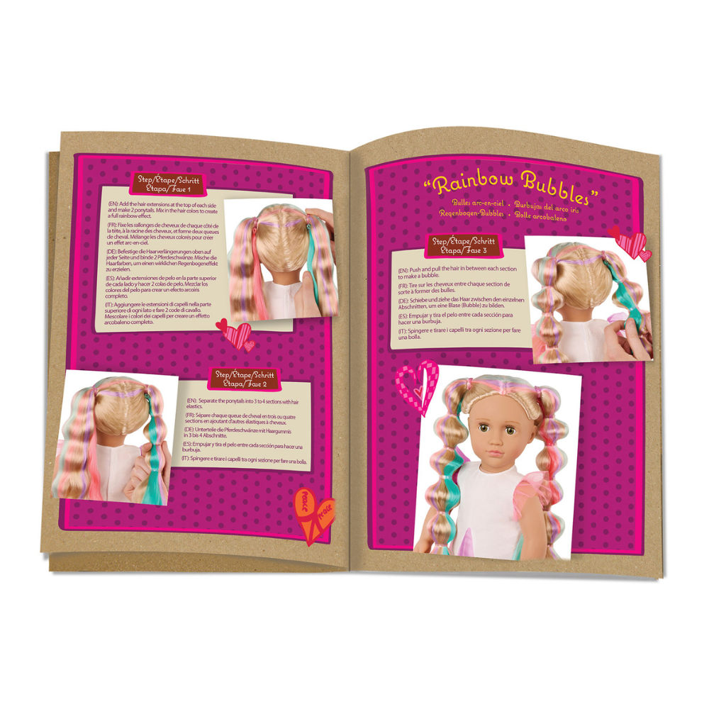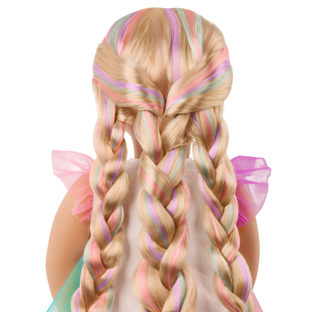 Deze pop is tot 46 cm groot, heeft een zachte torso en lang, verstelbaar blond haar met kleurrijke highlights dat op vele manieren kan worden opgestoken en gestyled.