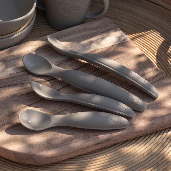 De set bestaat uit twee 16 cm lange siliconen lepels in de kleur Jetty Beige.