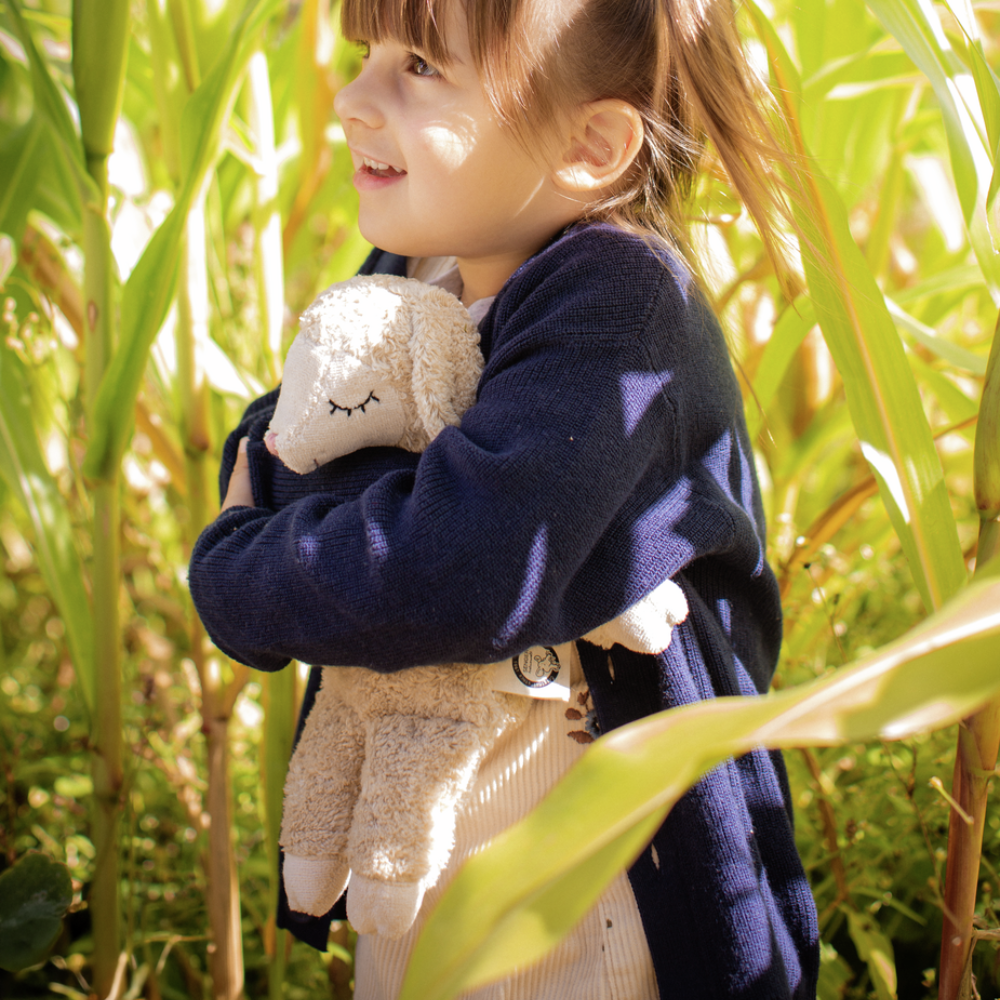 Hij is gemaakt van GOTS-gecertificeerd biologisch katoen en gevuld met zuiver schapenwol. Er zit een uitneembaar druivenpittenkussen in verborgen dat zachte, natuurlijke warmte geeft.