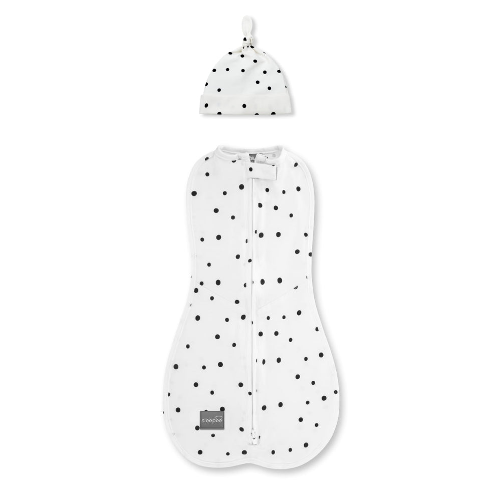 De First Step babywikkel met kapje Zwarte stippen van Sleepee helpt om de slaap- en waakcyclus van je baby te organiseren, en recreëert wat je baby al heeft geleerd in de buik van zijn moeder.