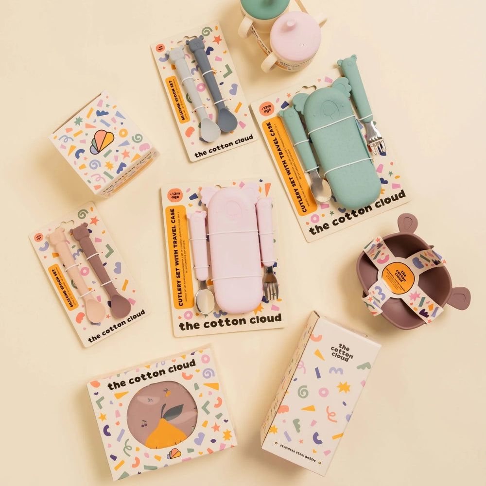 Cotton Cloud heeft ook aan het praktische aspect gedacht - er wordt een siliconen hoes meegeleverd waarmee je het bestek van je kind thuis en onderweg hygiënisch kunt opbergen.