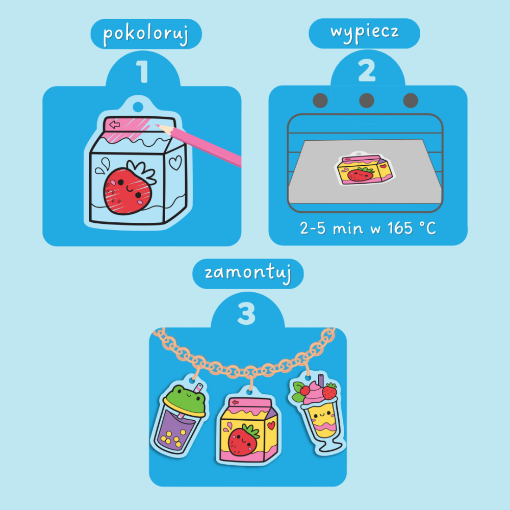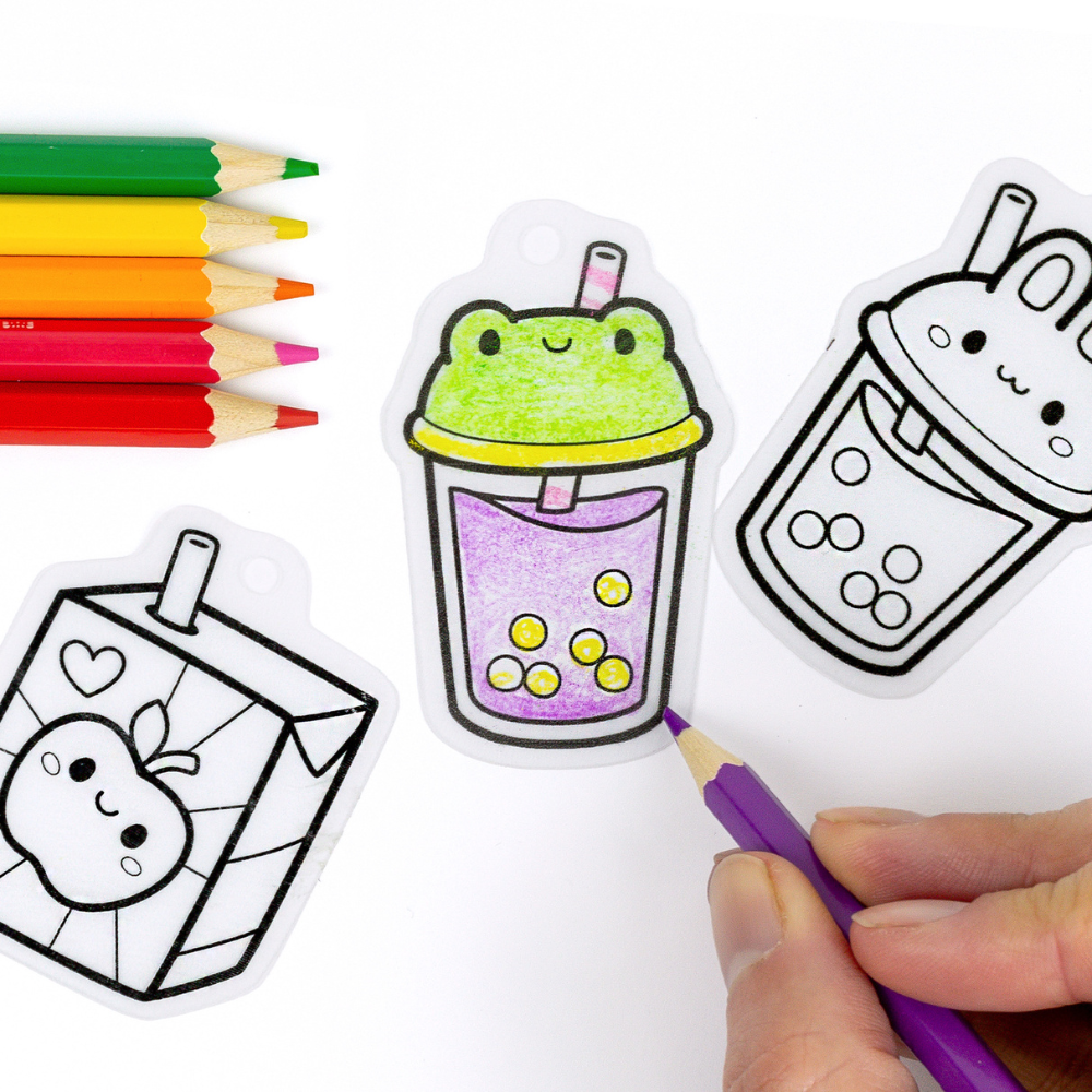 Het enige wat je hoeft te doen is de geïllustreerde voorgeknipte ontwerpen inkleuren, ze in de oven doen en kijken hoe ze krimpen tot ongeveer 40% van hun oorspronkelijke grootte en hoe de kleuren intenser worden - echte magie in huis.